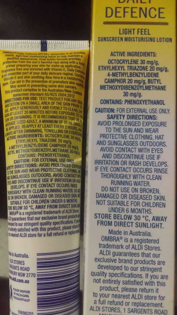The yellow tube is called Ombra SPF 50+ Daily Defence Light Feel. I bought this cream because it was so cheap and supposedly acted as both a moisturizer and a sun cream. I thought to myself, ‘Fantastic, this is two birds and one stone. This is going to be excellent!’